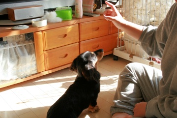 ダックスは肢が短いので、頭だけ下げてもフードに近づけるから、フセない場合は、