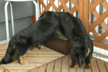 あずきをフードでつりながら、「フセ&マテ」トレーニングをやっていると、フードの匂いを嗅ぎつけた杏が便乗しているんです。