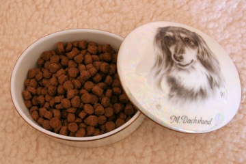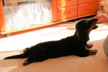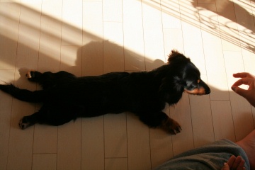 ダックスは肢が短いので、頭だけ下げてもフードに近づけるから、フセない場合は、