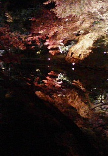 臥龍池(がりゅうち)に、ライトアップされた様々な色の紅葉が鏡のような池に映っています。