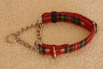 当犬舎オリジナル・この赤いタータンチェックのハーフチョークとリードをPIXYくん家が