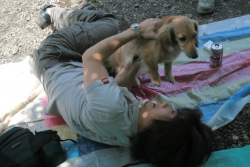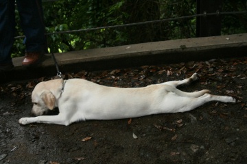 途中休憩で、身体を冷やすラブラドール・レトリバーの「メグちゃん」