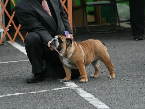 クィーンに輝いたブルドッグ。審査中にハンドラーさんがこの子を抱えたとたん、前のめりに倒れてしまったりして、かなり別な意味でも目を引きました。